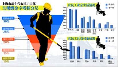 从全国看,这一群体结构为“圆柱形”,即各类型各占约20%比例;而在上海,这一群体结构呈现“倒三角形”,即积极奋斗型人数最多,“正能量”占比大,结构也更“健康”。比如他们愿意参加体锻、结伴旅游等社交活动,也愿意在网络上查找信息并发表个人见解,这都反映新生代农民工正逐步打破“同血缘、同乡缘、同业缘”的圈子限制,逐步融入城市。